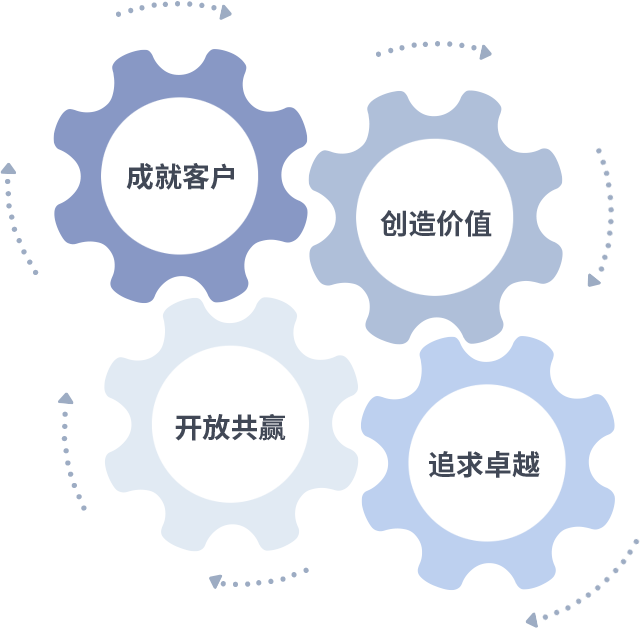 成就客户是一切决策的出发点,,,,创造价值是衡量所有工作的标准,,,,追求卓越是我们做事做人的态度,,,,开放共赢是我们的格局也是最终的结果。。价值观的齿轮环环相扣,,,推动着组织里的每个人不断向前。。。